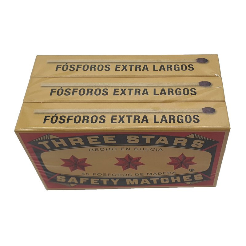 Extra Long Three Stars Safety Matches. Comes with 3 boxes of 45 Matches per box. The measurement of the package of 3 is 4.25 L x 2.25H x 2.50 W. The length of the match is 3.75 inches. Perfect length for getting to the bottom of a candle jar.