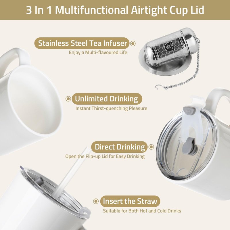 Sweejar Ceramic Travel Mug redefines convenience and style, offering a fresh approach to staying hydrated on the go. Crafted from premium ceramic, this coffee mug provides an exceptional drinking experience by retaining the temperature of your beverage while enhancing its flavor. The lid, made from durable acrylic, is as versatile as it is functional, featuring three unique drinking options: a direct sip spout for quick sips, a straw hole for enjoying your cold beverages in style, and a fully removable lid that lets you access your drink easily or clean it thoroughly. This innovative design caters to every need, whether you're in the mood for a hot espresso, iced tea, or even a smoothie. To elevate your tea-drinking experience, the tea mug includes a stainless steel tea infuser, ideal for brewing loose leaf tea without the mess of tea leaves floating in your drink. The wide, ergonomically designed handle ensures a secure, comfortable grip, preventing spills even while you're rushing through your busy day. The base is designed to fit snugly into most car cup holders, making it your perfect companion on the road. With its sleek ceramic body, stylish acrylic lid, and thoughtful accessories, it’s a must-have for anyone who loves their drinks at just the right temperature.