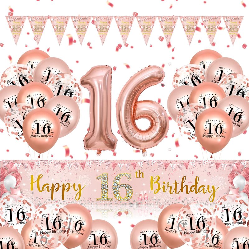 - 🍭Rose Gold 16th Birthday Decorations: There is 1pcs happy 16th birthday rose gold banner and 18pcs happy 16th birthday balloons with "16 happy birthday" patterns(6pcs metal rose gold birthday balloons and 6pcs balloons with rose gold sequins and 6pcs mette rose gold birthday balloons ) and a string 16th triangle flag and 1pcs 16 number foil balloon.With these so many rose gold birthday decor, they further set off a atmosphere of 16th birthday party.