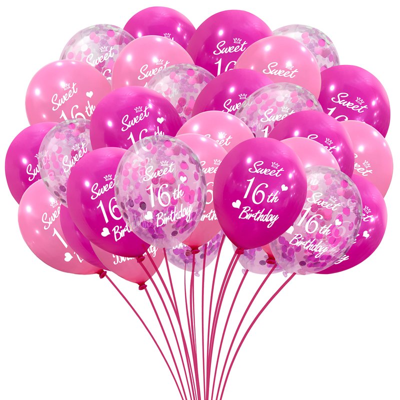 • Package Content:Sweet 16th birthday latex Balloons with 10 pieces 12 inch dark pink latex balloon printed "16th Happy Birthday",10 pieces 12 inch pink latex balloon printed "16th Happy Birthday",10 piece 12 inch hot pink confetti balloons. pink and hot pink confetti balloons will create a joyous atmosphere and leave unforgettable memories for you and your party guests.