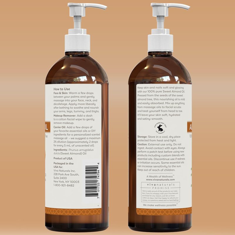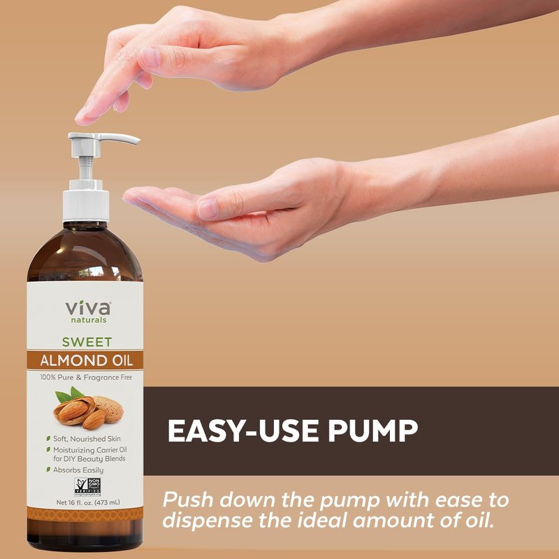 - QUALITY YOU CAN TRUST β Viva Naturals pure almond oil is expeller-pressed from the almonds grown right here in California, USA. Plus, itβs Non-GMO Project Verified, hexane-free, not tested on animals, and no added ingredients.