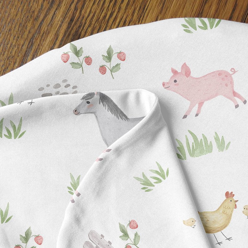 - 95% Rayon / 5% Spandex Jersey Stretch Knit featuring multicolor watercolor farm animals