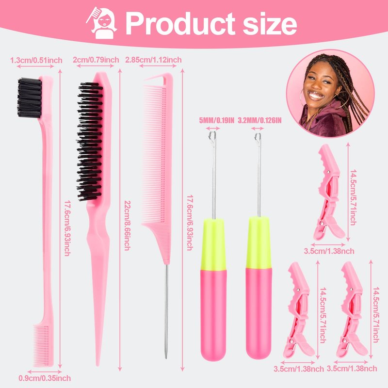 2pcs Dreadlock Crochet Needle,3pcs Gator Clips,1pcs Edge Brush,1pcs Bristle Hair Brush,1pcs Rat Tail Combs Metal Pin.