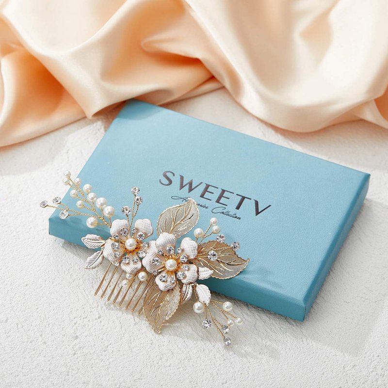SWEETV Gold Wedding Hair Comb-Handmade Bridal Hair Clip Wedding Hair Accessories for Women