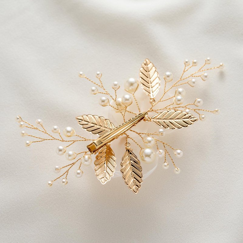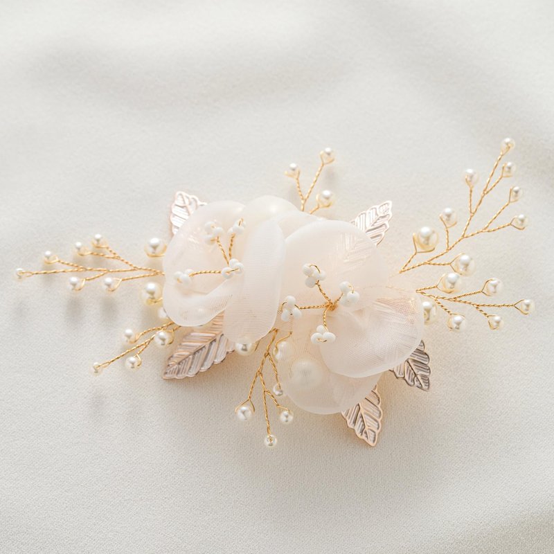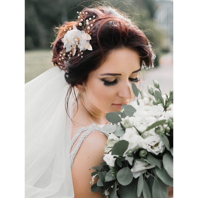 • 1.Pretty floral bridal hair comb made up of Light Weight Material: delicate white fabric flowers and dainty gold leaves, accented with shimmering pearls and crystals, gently clip it in your hair,it will keep a whole day.