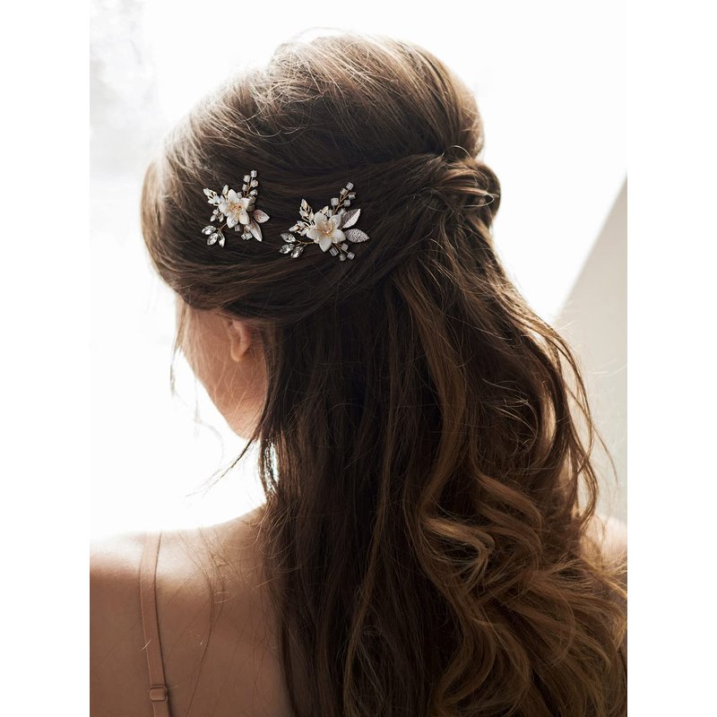 - ❀Material: set of 2 wedding hair pieces are made of rhinestones, white ceramic flower and light rose gold plated leaves,100% handmade and well crafted.