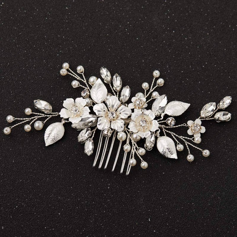 - ❀Material: Delicate wedding hair comb made of exquisite crystals, pearls,silver plated petals and leaves, soft alloy wire,100% handmade and well crafted.