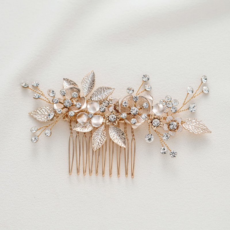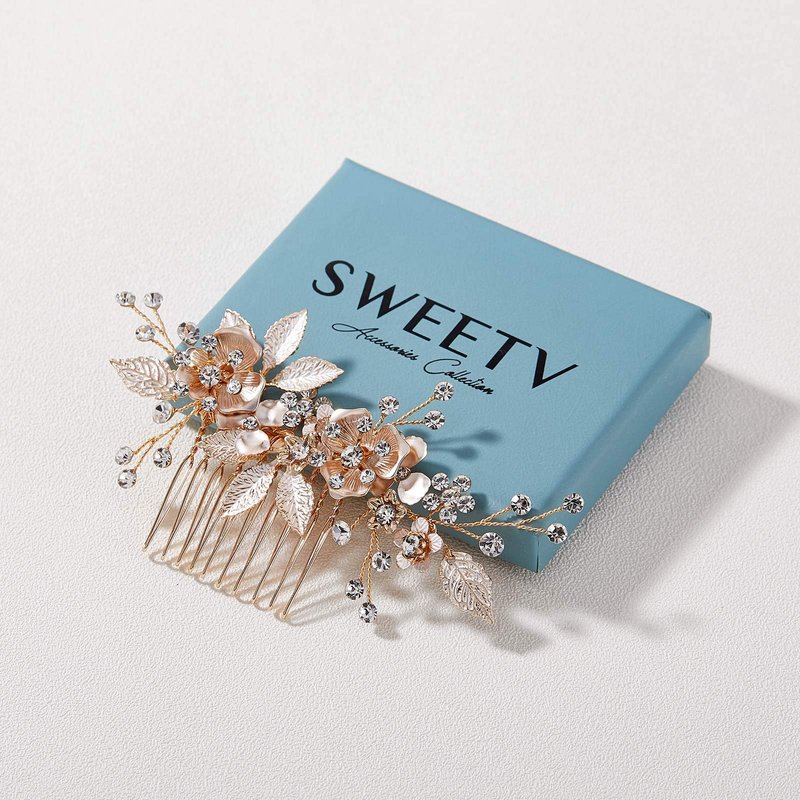 - ❀Material: Delicate wedding hair comb made of rhinestones, rose gold plated petals and leaves, soft alloy wire,100% handmade and well crafted.