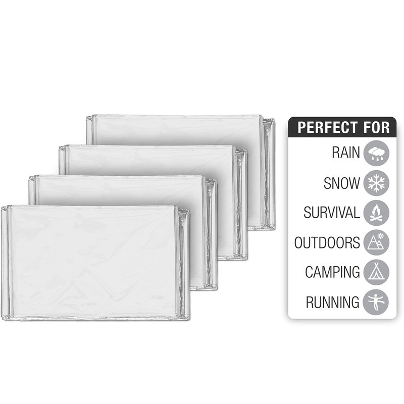WHY SWISS SAFE BLANKETS Swiss Safe Products has designed the most advanced emergency blanket on the market - meticulously designed for outdoor survival, emergency preparedness or emergency first response. PREMIUM MYLAR: It all starts with the material, metalized polyethylene, that reflects 90% of your body heat while offering resistance from rain, snow, moisture, cold, and heat. ULTIMATE VERSATILITY: Waterproof, windproof, and snowproof blankets are great for emergency first aid while hiking, backpacking, climbing, camping, mountain biking, or just lost in the wilderness. CONVENIENT 4-PACK: Includes four individually wrapped blankets so you can easily throw them in your backpack, car, go-bag, or camping bag. Small enough to keep anywhere for when emergency strikes. EXCLUSIVE COLORS: The only thermal blanket to offer a unique variety colors while also providing a superior product design with emergency survival in mind. All colors offer the same thermal efficiency performance. Perfect for keeping dry in damp, wet, cold, rainy environments. UNLIMITED USES: Use as tent footprint, backpack cover, rain poncho, emergency signal, solar oven, shade cover, fishing lure, bird repellent, emergency shelter, sleeping bag liner, ground cover, bivouac sack, wind blocker, arm sling, tourniquet, bivvy, trail marker, water collector, or even snow melt container. Even more creative uses: Some customers even report using these for halloween costumes, christmas gift wrapping paper, or other holiday decorations. We always love to hear what creative uses our customers come up with! TRUSTED QUALITY: Customers from the around the world trust Swiss Safe to supply their emergency preparedness needs. If you are not completely satisfied with the quality of your item, we will happily replace and/or give you your money back - no questions asked!