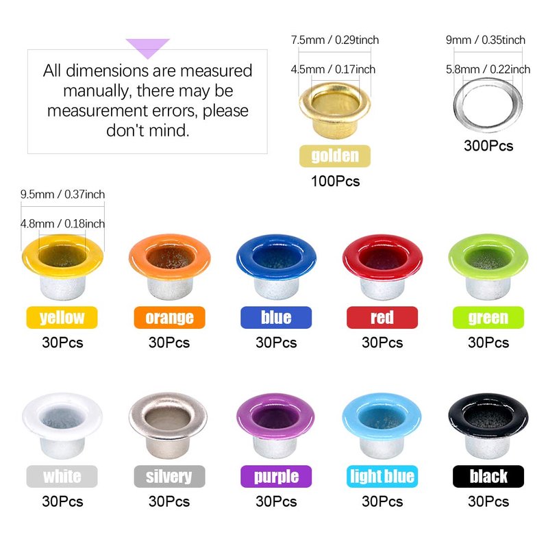 - ★ 10 Different Eyelets color ----- 10 colors of 5mm eyelets are White, Black, Silver, Dark Blue, Shiny Green, Red, Orange, Purple, Yellow, Blue, Each Color 30 sets, Each set of grommet includes 2 parts: an eyelet and a washer. So many different colors, Can meet all your daily needs.
