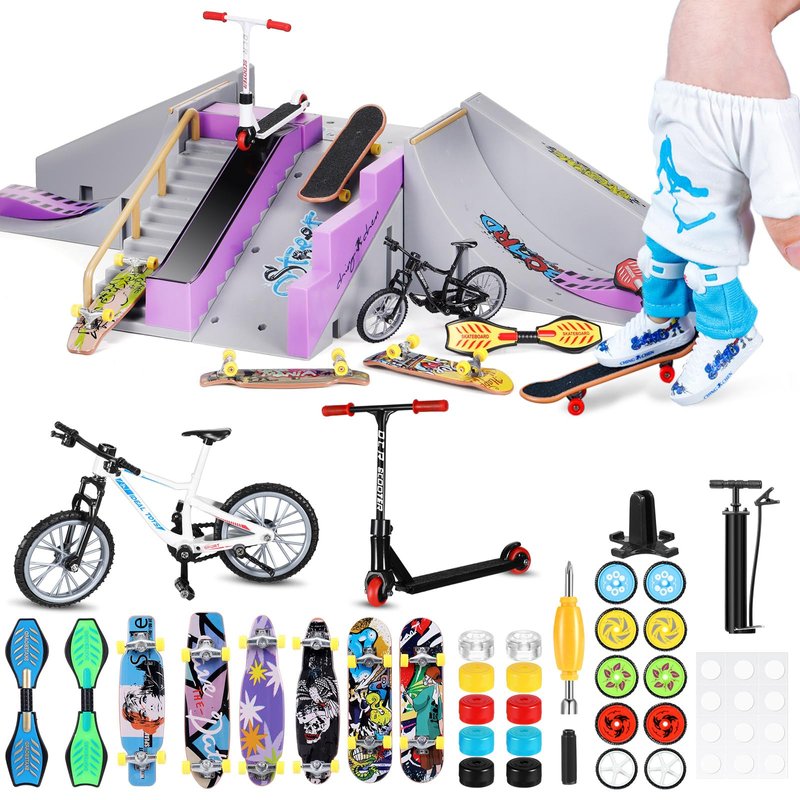 - Package Includes: the package includes 7 skateboarding sites, 1 sticker, 8 fixing frames, 10 finger skateboards, 1 finger coat, 1 pair of finger pants, 1 knee pad, 1 pair of shoes, 2 bikes, 4 swing boards, 2 scooters, 20 skateboard replacement wheels, 10 bike replacement wheels, 4 mini tools and 1 pump, providing, this skateboard kit can meet your playing needs