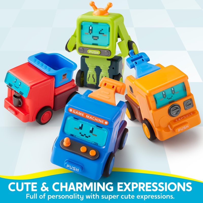 SYNCFUN 4 Pack Toy Cars for Toddler, Push & Go Transforming Robot Toy Cars, Construction Vehicles Set for Boys Girls, Birthday Party Favor Gifts for Kids