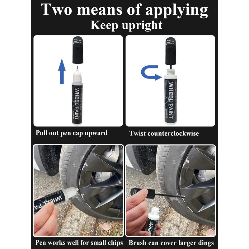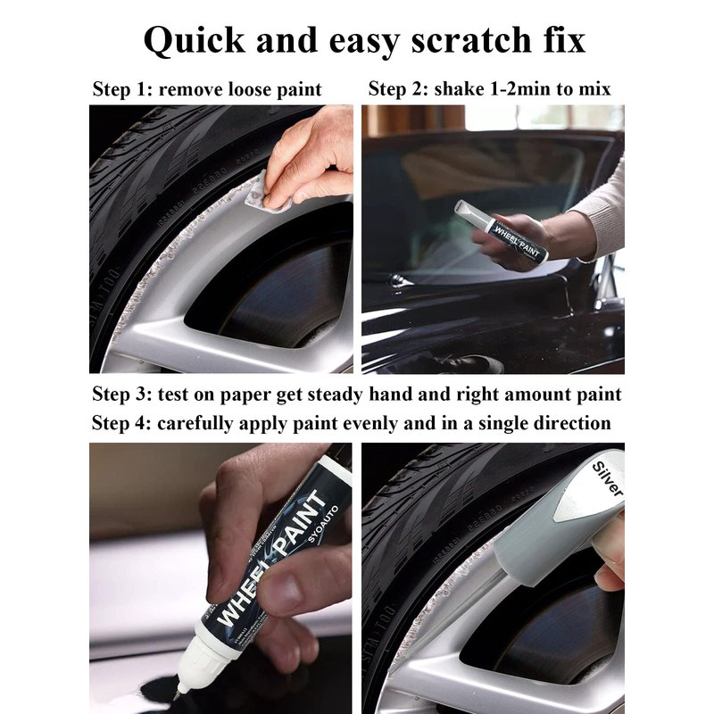 - Quick and easy scratch fix: This rim scuff repair is easy to use. Just clean and degrease the surface, and shake it for about 2 minutes to really mix it well. The pen works well for small chips, the brush can cover larger dings. It will dry within 10 minutes