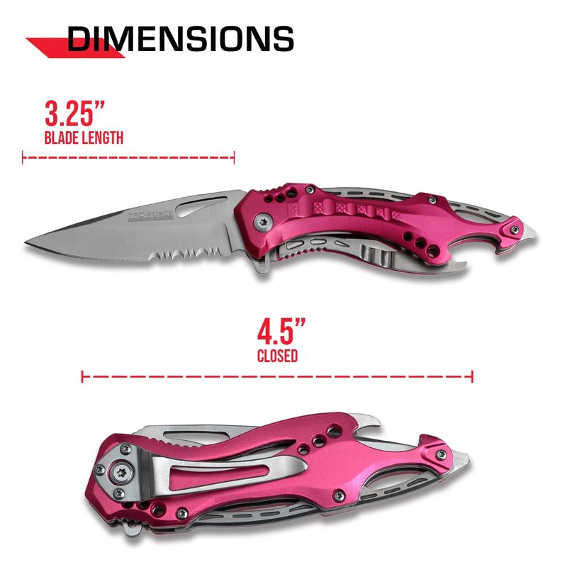 TAC FORCE Spring Assisted Folding Pocket Knife – Black Stainless Steel Blade with Pink Aluminum Handle, Bottle Opener, Glass Punch and Pocket Clip, Tactical, EDC, Rescue - TF-705RD