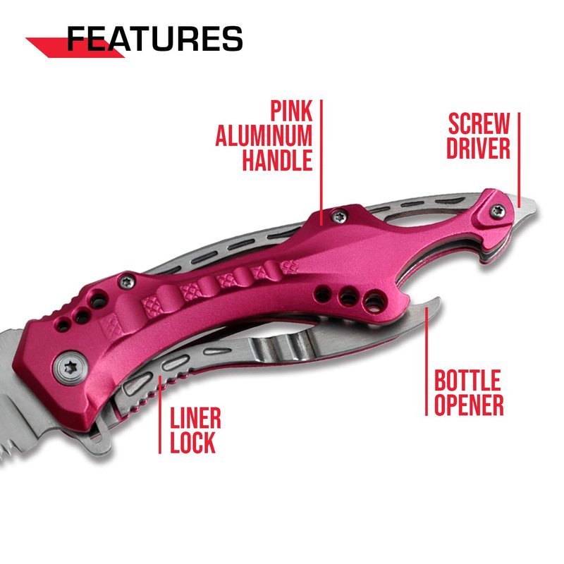 - SPECIAL FEATURES: Spring Assisted Finger Flipper Blade Cut Out Pocket Clip Pink Aluminum Handle with Satin Finish Stainless Steel Liner Liner Lock Glass Punch Bottle Opener.
