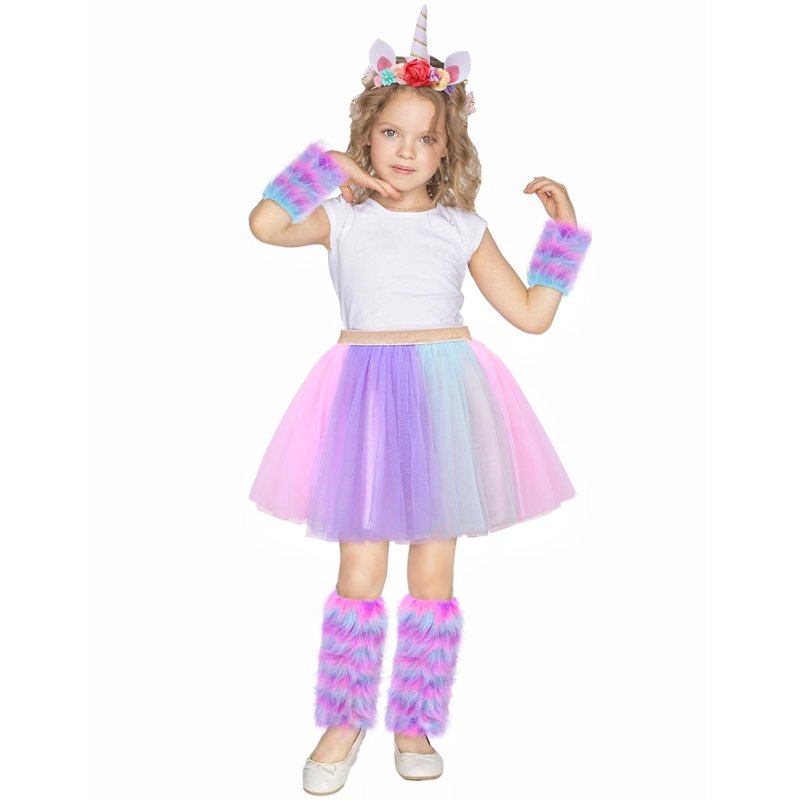 - UNIQUE UNICORN COSTUME - Designed for little girls age 3-8 years, our delightful costume set includes a pair of fluffy leg warmers, gloves, tutu skirt and a unicorn headband. Quite versatile and can be paired with other clothes arbitrarily, such as a white T-shirt, sweater, or blue coat. Dress up as a cute fluffy unicorn, your girls will love exploring the whimsical world of unicorns, spreading magic and joy wherever they go.