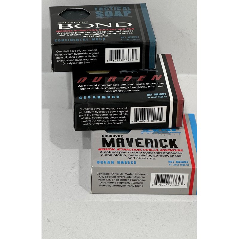 One Bar of each of our Powerful Pheromone Blends. Sometimes you like to mix it up. Every situation may call for a different blend. Durden (Bad Boy), Bond (Heroic Bad Boy), and our latest Maverick (Playful adventurous Bad Boy)