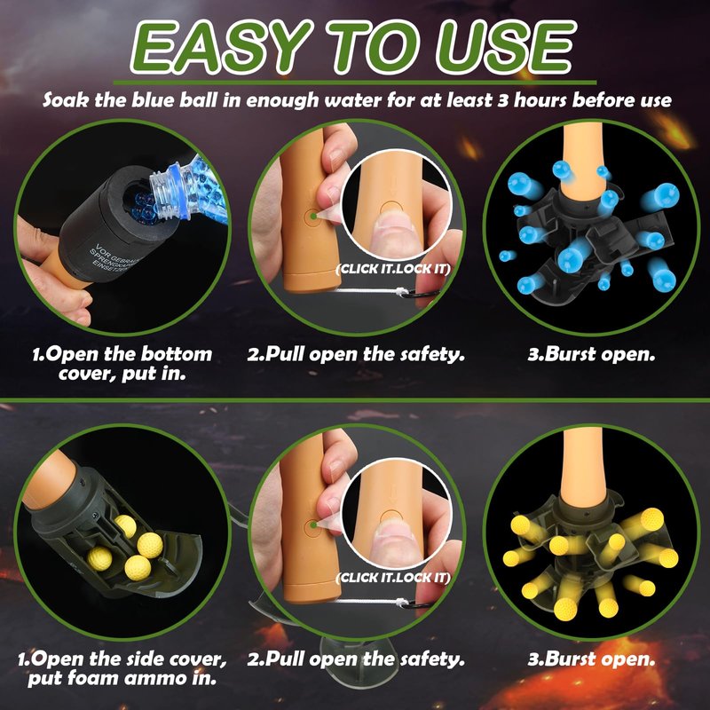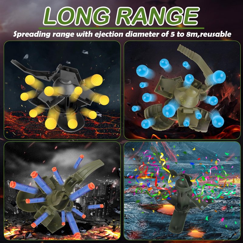 - Easy To Use:Unscrew the rear cover, loading foam ammo or flour, tighten the back cover, wait for your right game moment, pluck the pin and throw it out just.