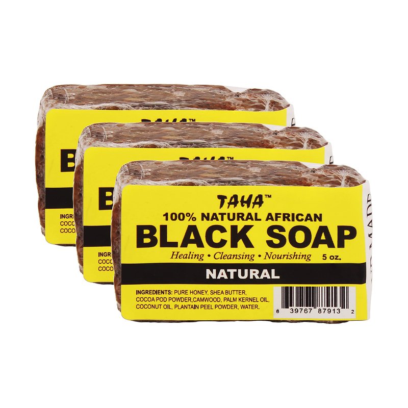 Taha African Black Soap Bar, Organic & 100% Natural, Soothing & Moisturizing, Healthy Cleansing – Great for Blemishes, Acne, Dry Scalp, and More, Natural Scent, 5 Oz (Natural, Pack of 3)
