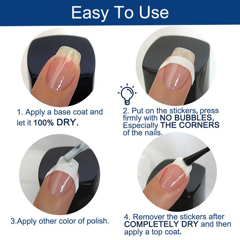 - EASY TO USE: Work great with regular polish and acrylic nails. Just press French stickers firmly with NO BUBBLES and remover after completely dry, nail polish would not seeps in from underneath.