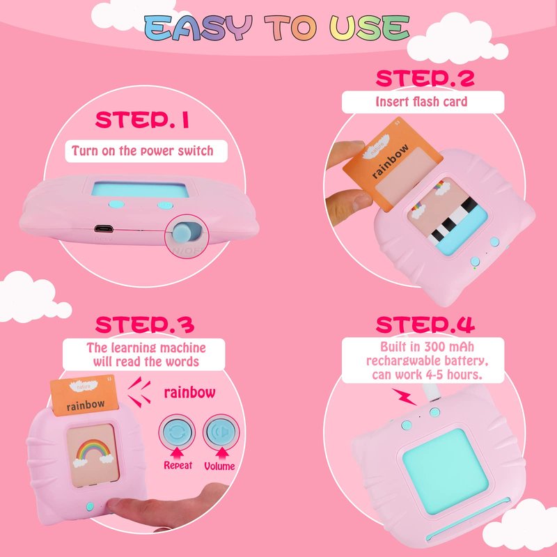 - Interesting Flash Cards for Toddlers: The talking flash cards have 112 double-sided cards containing 224 visual words, for example, animals, daily necessities, people, colors, vehicles, food, vegetables, nature, etc. These card early education device can greatly stimulate children's imagination, allowing them to expand their horizons while having fun. Great learning toys for 2 year olds.