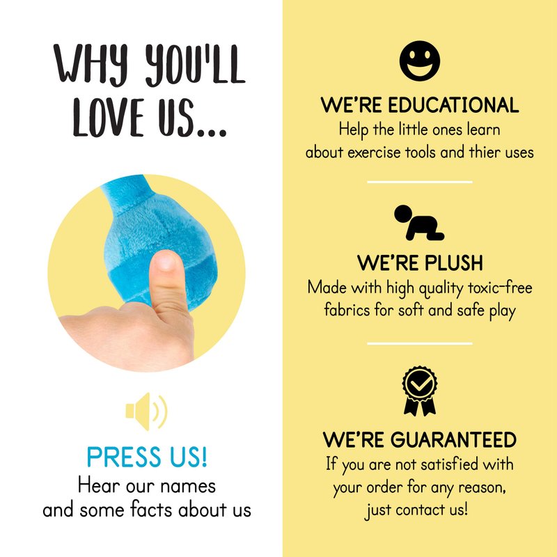 - 🏋INTERACTIVE: Just squeeze or hug the super-soft plush workout gear to hear what they are and what they are for! Turn playtime into an enjoyable moment; promote fine motor skills, engage them in creative, pretend, and imaginative play! It’s an ideal holiday gift, party supply, and/or Christmas present for any plush toy lovers.
