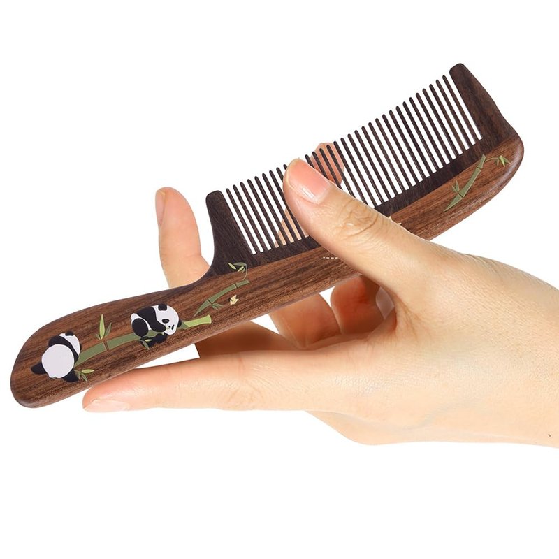 Material: Chacate Preto Size : 18*4.35*0.8 cm Package Dimension: 24.8*10.8*3.9 cm FEATURES + Pattern is hand-painted, showing 2 pandas play and eat the bamboo. + Handcrafted and painted from high-quality wood. + Long wood handle, easy to use. + Compared to plastic alternatives, wooden combs better reduce hair loss and breakage. Combing Tips + Avoid metal or cheap plastic combs, whose edges can lacerate individual strands. + Be gentle and don’t overdo it. + Brush out knots before even getting in the shower. + Wet hair is swollen by 20-30% , roughly combing it when it is wet. + Always work out tangles starting from your ends.