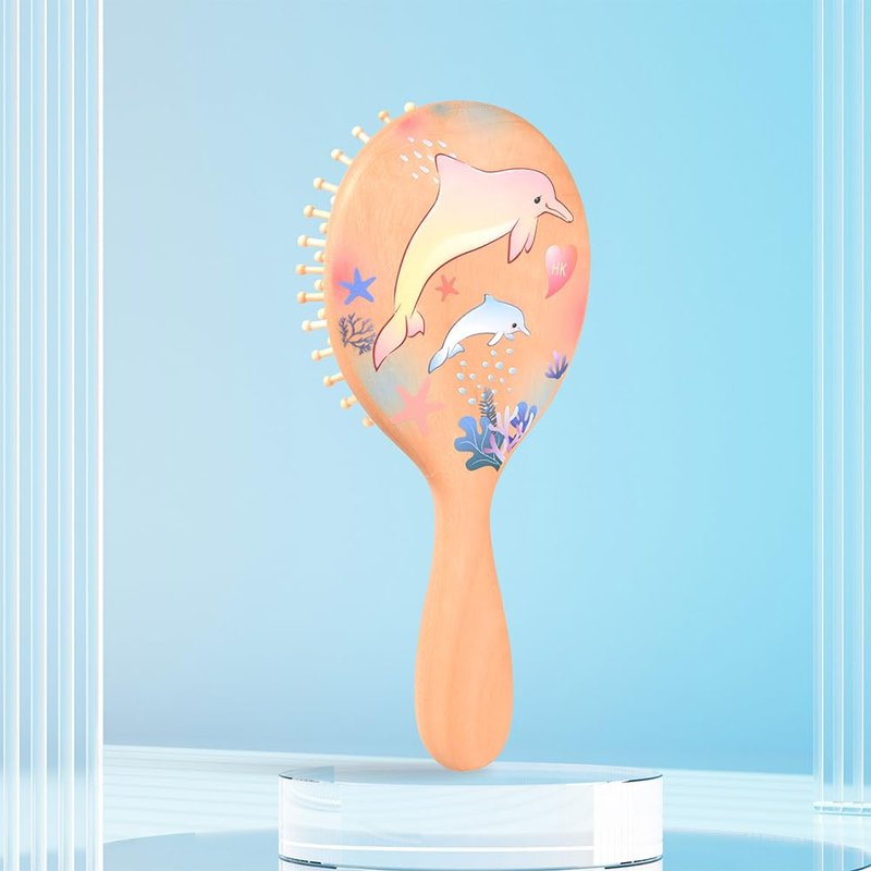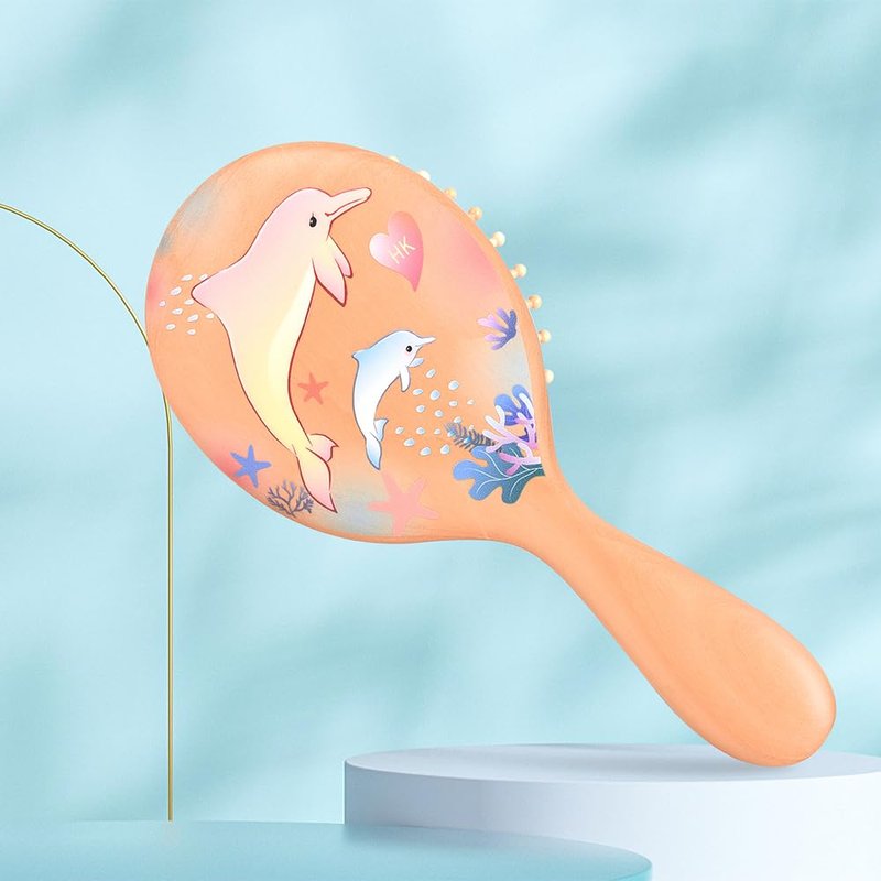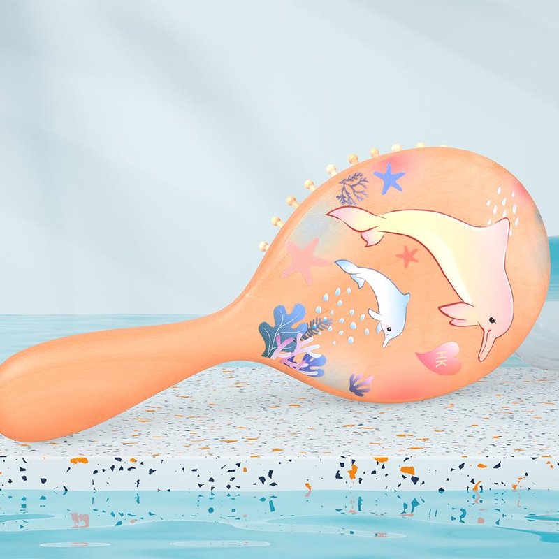 Material: Teak Size : 18*8*1.7 cm Features: + Hand-painted colorful dolphins with smooth line, looking vividly . + The soft, wooden bristles glide seamlessly through strands without snagging or causing breakage. + Unique handle shape and cushion design regulate the penetration of each tuft to effectively condition the hair and scalp.