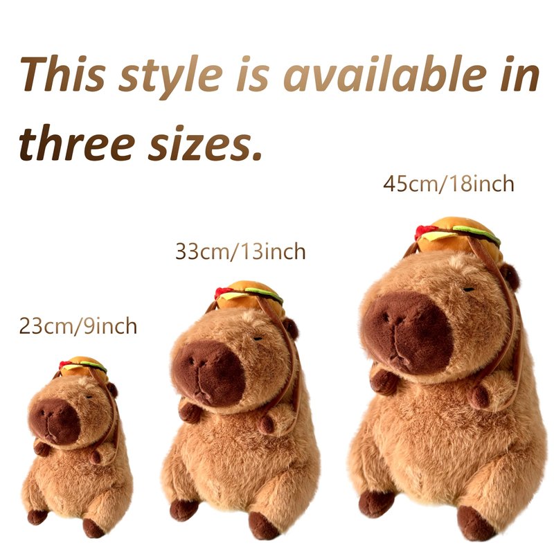- Cute Capybara with Hamburger Backpack: Original design, cute shape and exquisite workmanship details make this capybara plush toy unique and eye-catching.