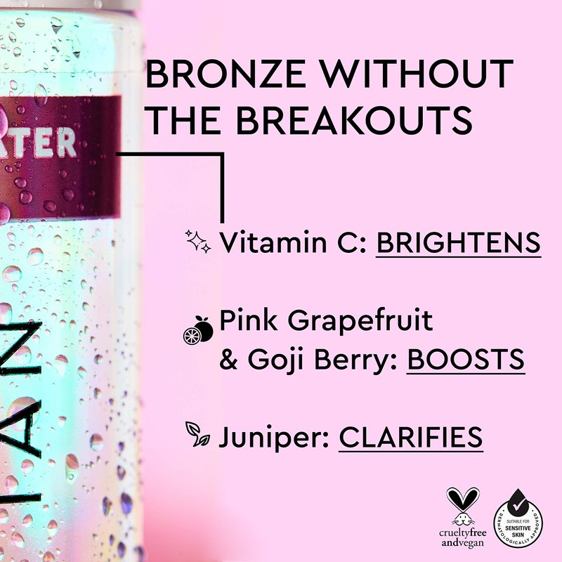 Mist n’ Glow with our Self-Tan Water. We’ve bottled an effortless Golden Hour Glow with this transparent multi-use self-tan mist for face & body. Lottie loves using hers as a glowy, makeup setting spray. Application is quick, easy & mess free. Just mist onto skin and blend. Available in 3 adaptable shades, choose yours based on your desired end-result: Light Glow Medium Tan Deep Bronze No colour guide means: No blocked pores No drying effect on the skin No tan-transfer onto sheets or clothes Our Self-Tan Water brightens, softens and hydrates skin with our signature trio of Pink Grapefruit, Goji Berry & Juniper. The non-comedogenic formula is lightweight and won’t clog pores, so can be used on both face & body. We LOVE storing ours in the fridge for an extra refreshing application.