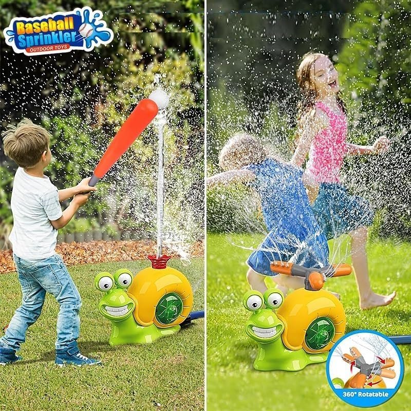 - 2 IN 1 Snail Sprinkler Toys: One is a water column nozzle that can be combined with the included tball bat for kids 4-6 to baseball batting skills; the other is a 360° rotating nozzle with a wide spray area that allows kids to play happily in the summer