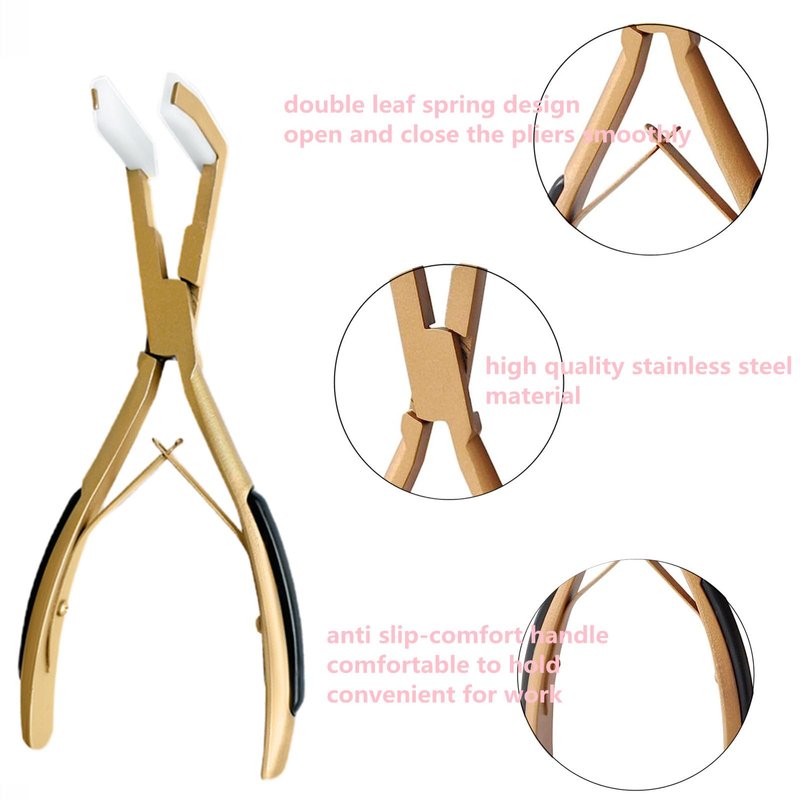 - Hair Extension Pliers Material:Hair extensions tools made of stainless steel,gold color.Both sides of the handle are made of non-slip rubber material, which is more comfortable to use.