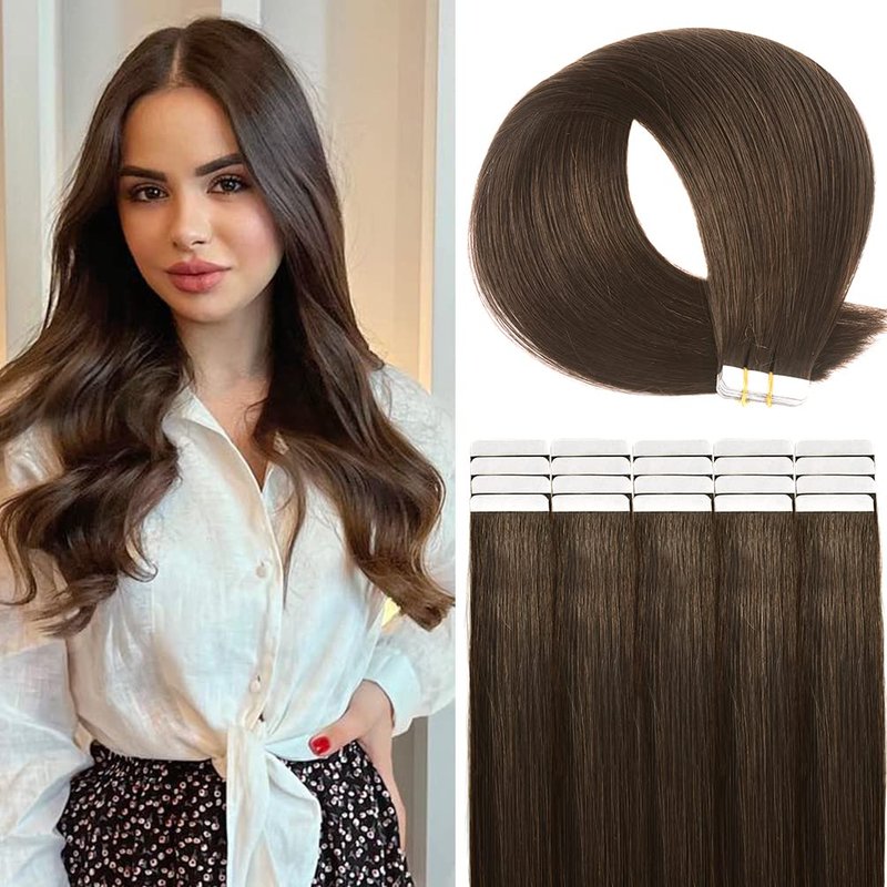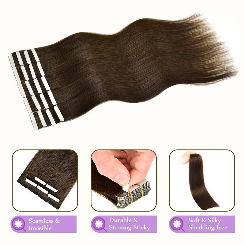 - 👍【High-Strength Thin Tapes & Easy to Take Out】 Chocolate Brown tape in extensions. Upgraded tape is not only less bulky, but very comfortable, also super durable strong. Chocolate brown human hair extensions can last for 8-12 weeks under carefully care. The tape in hair extensions human hair is easy to install and remove. Upgraded human hair extensions tape is thin and light, without pressure, without any discomfort or injury. Chocolate Brown hair extensions tape in.