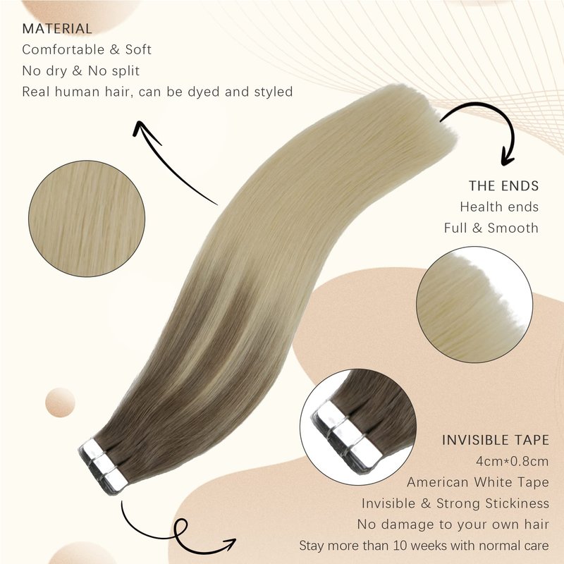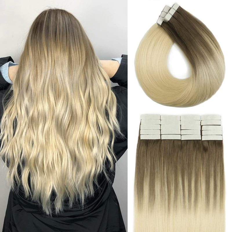 Tape in Hair Extensions Human Hair Ash Brown Fading to Platinum Blonde 100% Real Hair Tape in Extensions 20pieces 50g Natural Hair Extensions for Women (8t60 16in)