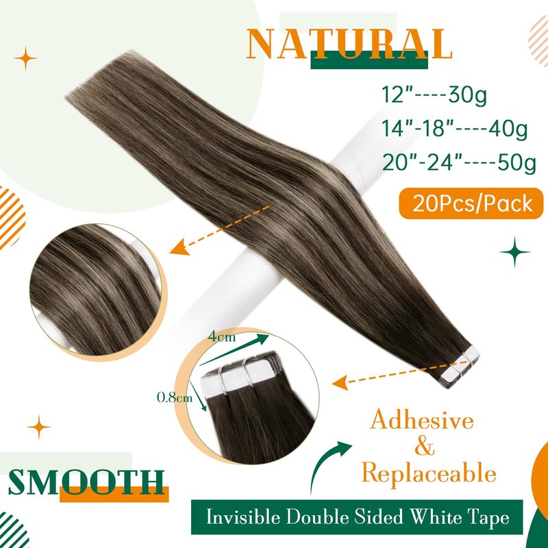 - 【Specification: Length & Weight】 Weight: 12” 30g, 14”-18” 40g, 20"-24" 50g, total 20 pieces. Thick Ends: Easyouth Tape in Hair Extensions is thicker at the ends, so if you have normal hair volume, about 1-3 packs can make a full head. Our uniquely delicate acid-free treatment process ensures the hair will remain healthy, glossy and in excellent condition throughout its life.