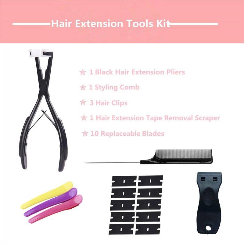 - Tape in Hair Extension Plier Kit:1 hair extensions pliers,1 rat tail comb with stainless steel pintail,3 hair clips for styling,1 hair extension tape removal scraper,10 replaceable blades.