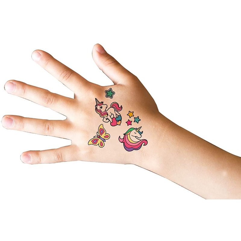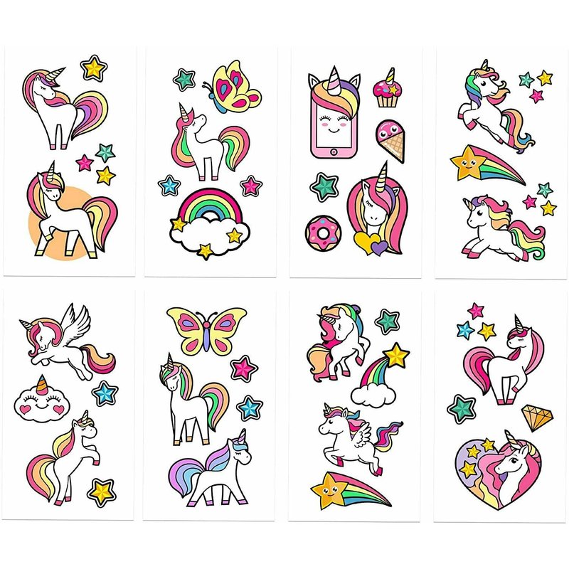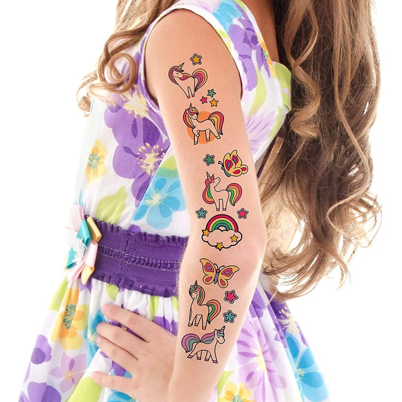 - Each unicorn temporary tattoo transfers sheet unicorns with different cute girly stciker designs for children which includes from star rainbows, butterflies, pony and more!