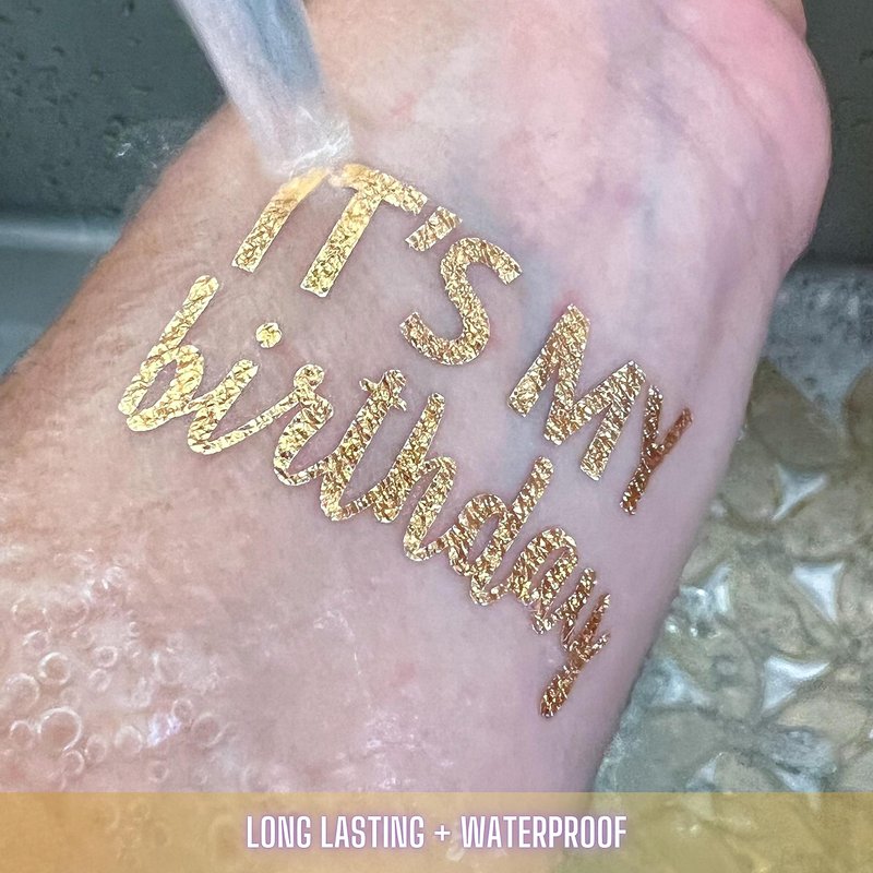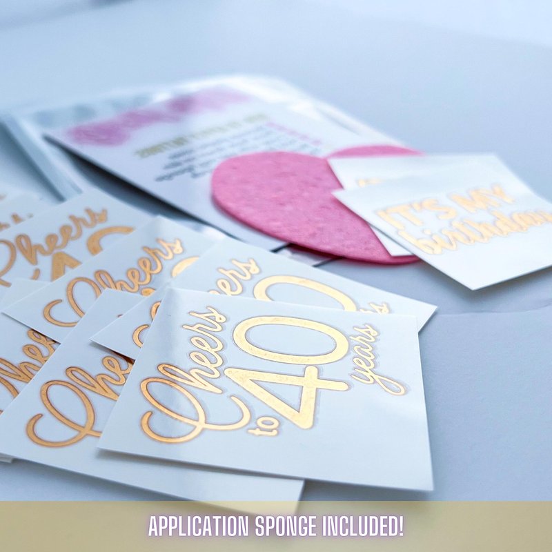 Are you planning or celebrating a 40th birthday? Look no further! Tats4Now presents the ultimate accessory to elevate your party - our set of 12 Metallic Gold Temporary Tattoos! Celebrate in Style: Get ready to toast the birthday person with these stunning metallic gold tattoos that perfectly capture the spirit of the occasion. With "Cheers to 40 years" for the guests and "It's my Birthday" for the Birthday person. You are sure to be making memories that will last a lifetime. High-Quality & Easy Application: Our metallic tattoos are made with the highest quality materials, ensuring they shimmer and shine just like real gold. Application is a breeze - simply peel, press, and revel in the glamorous transformation! Plus, with the pre-cut designs and application sponge you'll be ready to party in no time (No remembering a scissors or wasting time cutting these babies out). Perfect for Birthday Vibes: Whether you're taking off for a themed brithday destination or raising a glass around your kitchen table, our brithday party tattoos are the perfect complement to your celebration. These temporary tattoos will add a touch of elegance and fun to your special day. Unforgettable Memories: Create connection and fun memories of your birthday bash with these sparkling tattoos. They make for fabulous photo opportunities and will have your party squad looking fabulous in every picture. Safe & Lasting: Our tattoos have passed rigorous safety tests, making them suitable for all skin types. Rest assured, they're easy to remove when the party is over. However, while the celebration lasts, these tattoos will stay put, ensuring they shine brightly throughout your memorable weekend.