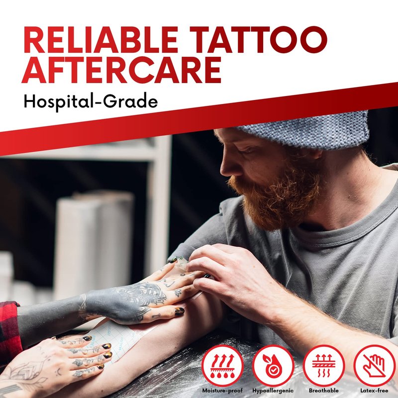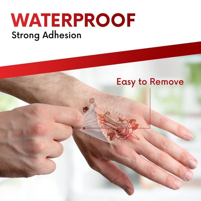- Waterproof Tattoo Dressing: To help ease your worries about touching water to your tattoo or open wounds, we have equipped our tattoo protective film with a strong adhesion which helps to keep moisture and water away from your skin while you take a shower, wash, or relax in the bathtub