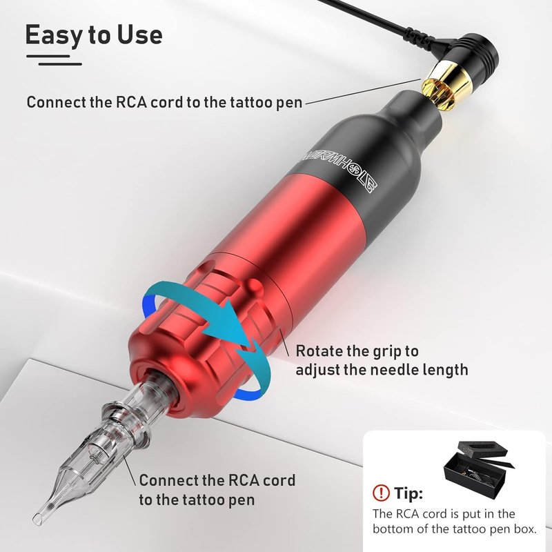 - 🎁【Tattoo Gun Details】Tattoo Gun is finely carved by aluminum alloy, low noise, powerful, long-lasting stability, can be used for shading and lining. Connected by RCA cord. Working voltage: 6-8V; RPM: 8000; Stroke: 3.5 mm, 3.5-4.5mm adjustable needle depth. This tattoo kit is a good gift for tattoo artists and beginners can also be bought as a birthday or anniversary gift.