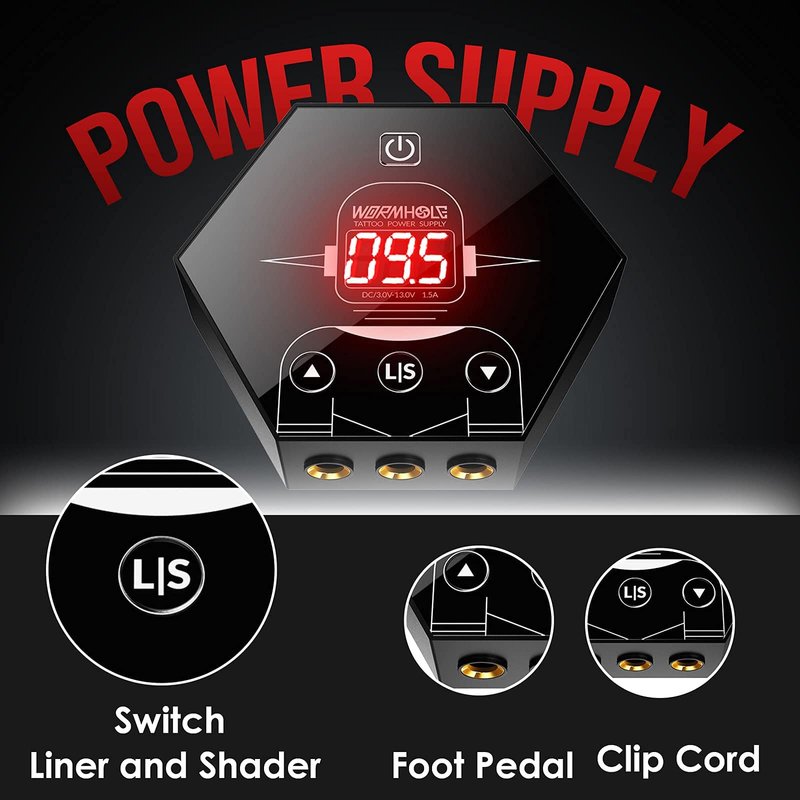 - 【Wormhole Power Supply】This dual control tattoo power supply has new technology and design, higher quality and more durable. Using the automatic protection function, when your voltage is too high or off-normal, the power will be automatically cut off, which can make your tattoo safer and protect your tattoo tool.