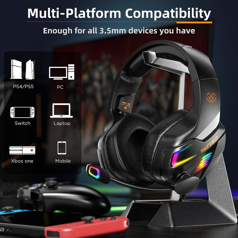 - 【Immersive 3D Surround Sound】 Tatybo gaming headset is equipped with advanced 50mm over-ear speakers, providing a virtual surround sound stereo effect, bringing you crisp highs and thundering lows sound quality, allowing you to fully immerse yourself in the gaming world and hear every detail and direction.