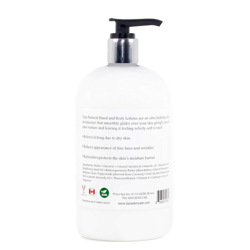 Taza Natural Hand and Body Lotions are an ultra hydrating, silky body moisturizer that smoothly glides over your skin giving it a smooth-as-satin texture and leaving it feeling velvety-soft to touch. Key Ingredients: Glycerin, Sunflower Seed Oil, Shea Butter, Coconut Oil, Sweet Almond Oil and Vitamin E. Our hand and body lotions also come in Unscented, and Coconut. These lotions are paraben, phthalates, gluten and sulphates free, and suitable for all skin types including the most sensitive. Get your Taza Natural Hand and Body Lotion.