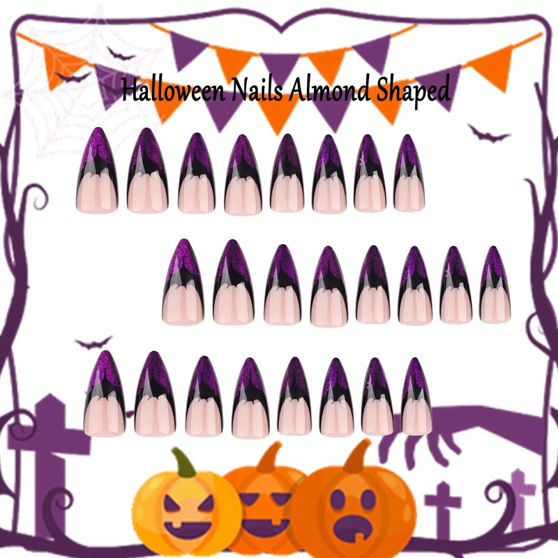 TBRZTR Halloween Press on Nails Almond Medium Nails Purple French False Nails Bat Design Halloween Nail Artificial Acrylic Nails Full Cover Reusable Coffin Nails Halloween Glue on Nails for Women