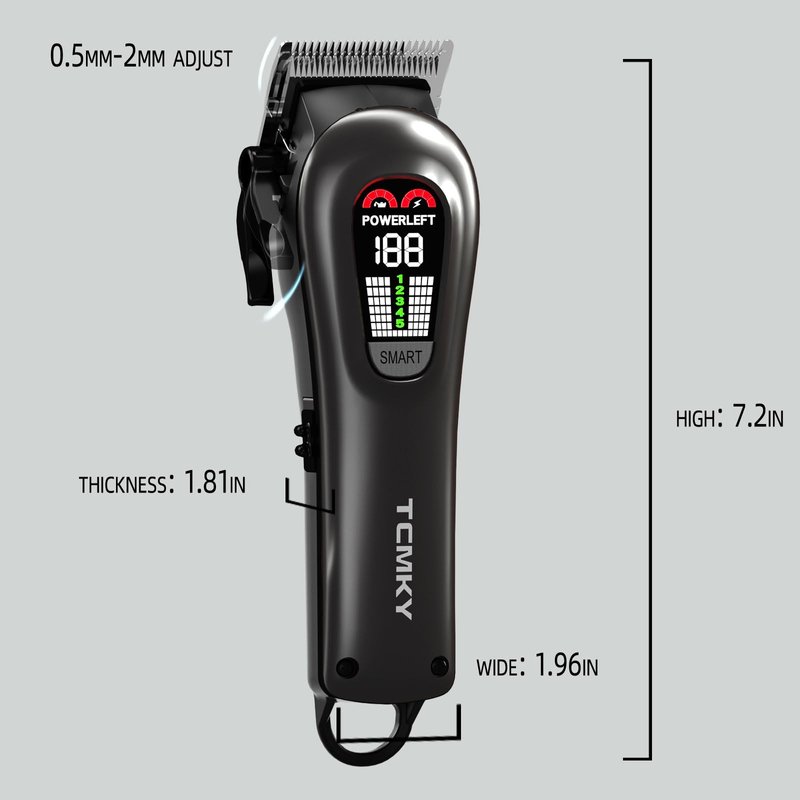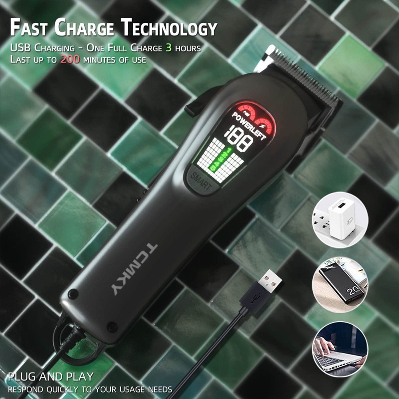 - 【CORDLESS&CORDED】TCMKY Hair trimmer can be with cord or cordless which is super convenient for self-cutting. USB charging 3Hours - One full charge Last up to 200 minutes of use.When the power of the hair clipper is used up,This hair trimmer supports plug and play.When charging, The charging capacity can be seen from the display.When the power in the display screen is 100%, unplug the power cord