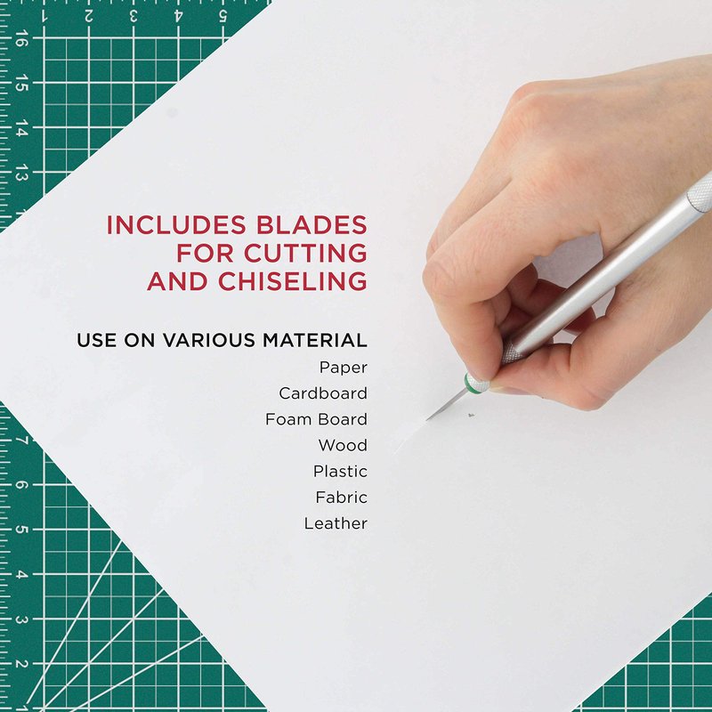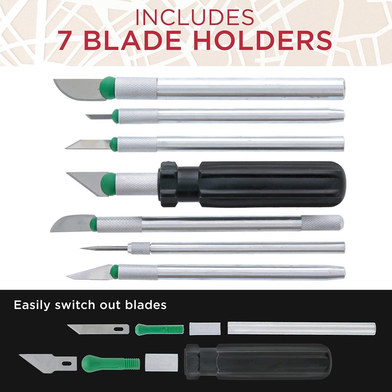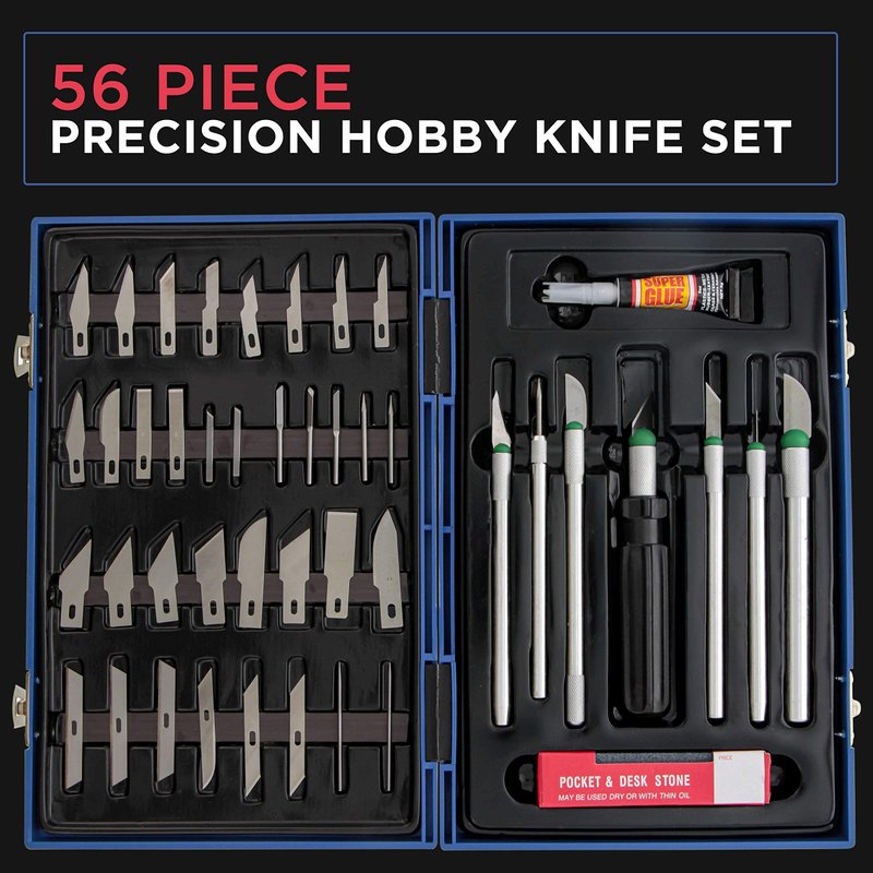 Within its sturdy plastic case are 7 knife handles: 1 — Mini Precision Handle for super delicate work 4 — Precision Handle for delicate work 1 — Medium Size for most types of work 1 — Heavy-Duty Handle for those large projects Set also includes: 40 — Precision Blades most of which are designed for different functions. 6 — Scribes 1 — Pocket and Desktop Sharpening Stone 1 — Super Type Glue for Plastics, Metal, Rubber, Leather, Glass and Ceramics 1 — Sturdy Plastic Case with Latches Keeps everything organized and the blades are all secured on a magnetic strip so you won’t loose another blade again.