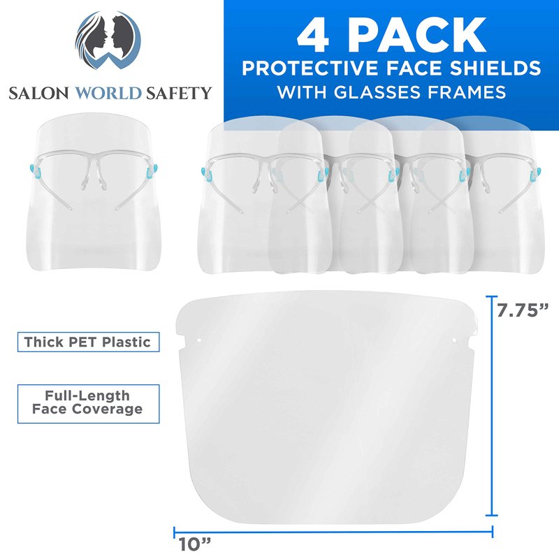 - 4 Pack of Face Shields with Glasses Frames: Sanitary, durable, lightweight, and comfortable premium protective face shields that are made with ultra-clear thick plastic. Each face shield contains an internally mounted comfort fit acrylic glasses frame. Wear the face shields just like you would when wearing glasses over your ears and on your nose bridge, but you'll also have a face shield for protection. Wear your eyeglasses underneath. One size fits all.
