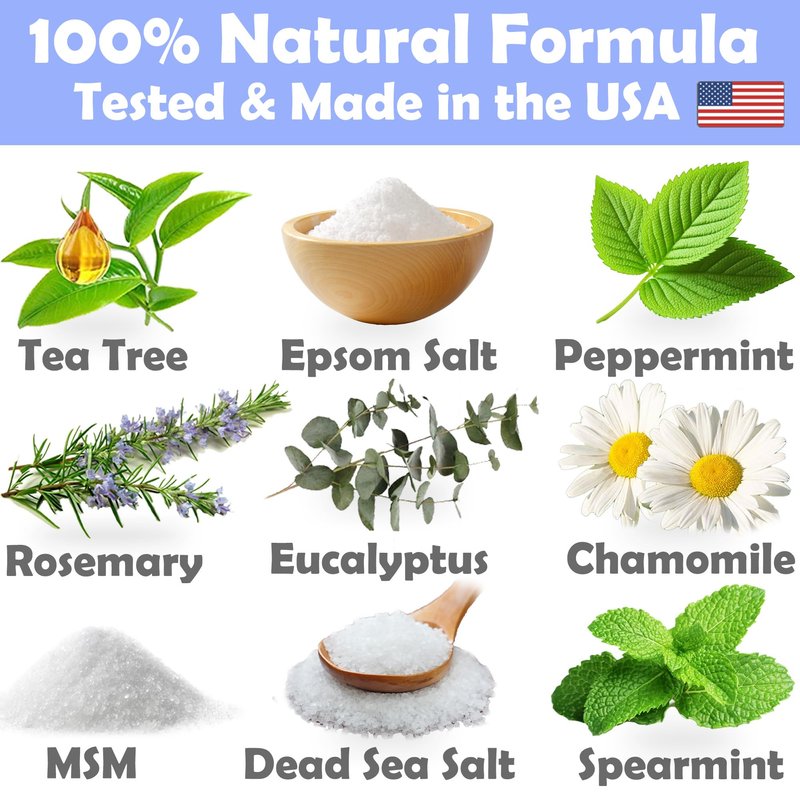 - ALL NATURAL INGREDIENTS: We use a unique powerful blend of Dead Sea Salt, Epsom Salt, MSM, Tea Tree, Chamomile, Rosemary, Eucalyptus, Spearmint and Peppermint.