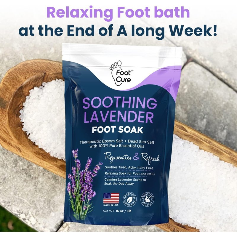 - 100% NATURAL FORMULA MADE IN USA: When it comes to our Foot Cure Lavender Oil Foot Soak, we make a point of using nothing but the finest natural and organic ingredients: Epsom salts, Pure Dead Sea salts, lavender oil, eucalyptus, Magnesium, peppermint, cajuput, camphor, rosemary, lavender, and other essential oils. Their powerful combined action of this toenail repair solution is the only weapon you will need for healthy feet.