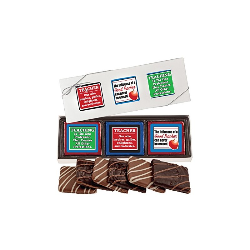 This is a ready-to-give, delicious Teacher Appreciation Cookie Gift. Six delicious, chocolate-covered fresh graham cookies, specially designed for Teachers / School Staff make this a perfect gift for serving or giving. A versatile (& delicious) treat! Fresh & delicious chocolate enrobed in premium (real) chocolate graham cookies are available in all sizes, but this 6-pc gift box is a top-seller. These are popular for Teacher Appreciation Day or anytime you want to say "Thanks" to a special teacher or team of Educators because the cookies are foiled with heart-warming messages of gratitude so the Teachers feel appreciated. Old-fashioned chocolate grahams....ours are double-dipped. We make these in all sizes and for all occasions. They make a great gift for anyone in a school, any teacher or group of teachers, office staff, administrative staff etc. Milk & Dark Chocolate assorted. Price includes six chocolate-enrobed Graham cookies, 3 foil-wrapped with Gratitude themed messages for Teachers and 3 unwrapped chocolate grahams (underneath the foil-wrapped ones) in an elegant white box with nested tray. Truly, a nice presentation! These do not need to be gift-wrapped. They are packaged ready to give.